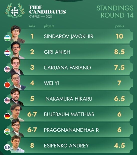Думаю, для истинных любителей шахмат будет интересно ознакомиться с итогами выступлений на главных соревнованиях года всех участников шахматного марафона… Вначале лишь напомню, что в предыдущей публикации под заголовком «Жавохир СИНДАРОВ и Рамешбабу ВАЙШАЛИ выиграли претендентские турниры по шахматам!» я рассказал в основном только о победителях. Однако для полной картины необходимо привести данные о результатах игры всех участников финальных баталий претендентского цикла. О том, как развивались события на турнирах претендентов и претенденток, вы можете прочитать в специальной подборке «Турниры претендентов-2026» канала «64 ФАНАТА ШАХМАТ». Gab DINUR. ФОТО: с официального сайта ФИДЕ.