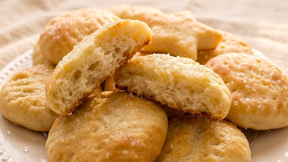 Готовое печенье получается объёмным, с золотистой нежной корочкой. На разломе видно пористую мякоть, похожую на булочку.