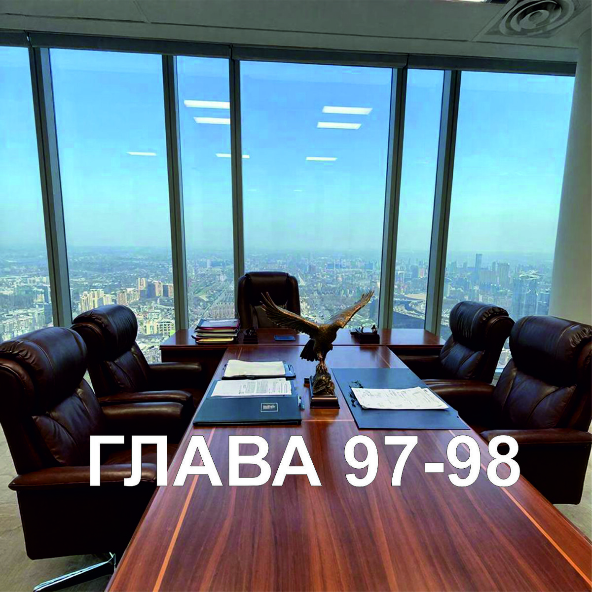 Вадим в кадре появился, сидя в большом офисном кресле. Они был в тёмном деловом костюме, в чёрной рубашке и с невозмутимым, но пронзительным взглядом. За его спиной были видны широкий экран и огромное французское окно, за которым высились многоэтажки делового центра города.