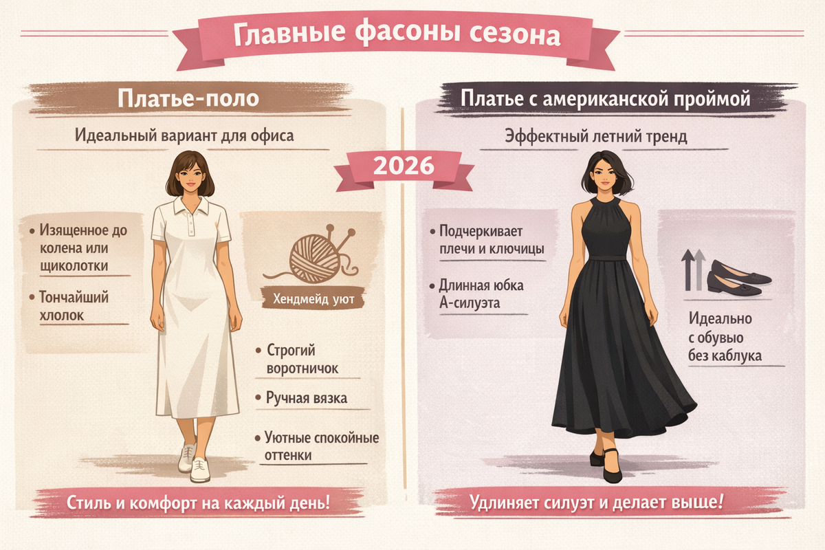 Другой важный тренд - платья с американской проймой. Они идеально подчеркивают плечи и ключицы. В 2026 году их модно носить с длинными юбками А-силуэта. Такое платье визуально вытягивает фигуру и делает нас выше, что особенно приятно для тех, кто не любит каблуки.