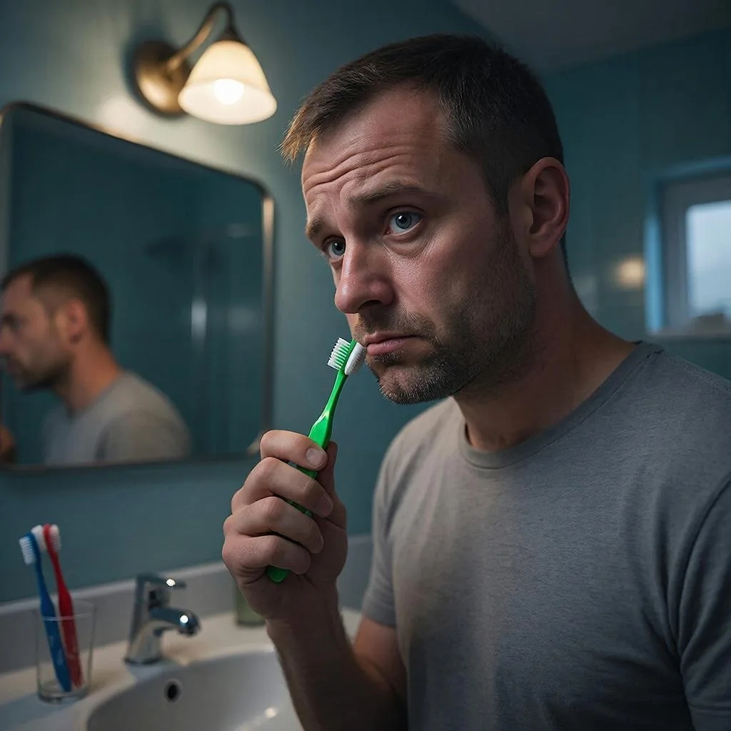 Я чистил зубы перед сном, как обычно. Взял свою синюю щётку, выдавил пасту. И увидел третью. Зелёная, щетина мягкая, новая. Стояла между нашими, ровно, аккуратно. Я замер. Потом сполоснул рот, вышел в спальню.