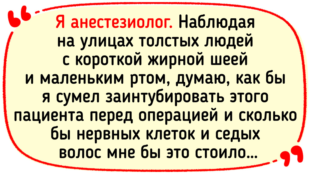 Я анестезиолог. Наблюдая на улицах толстых людей с короткой жирной шеей и маленьким ртом, думаю, как бы я сумел заинтубировать этого пациента перед операцией и сколько бы нервных клеток и седых волос мне бы это стоило… © Alexander P. / Dzen