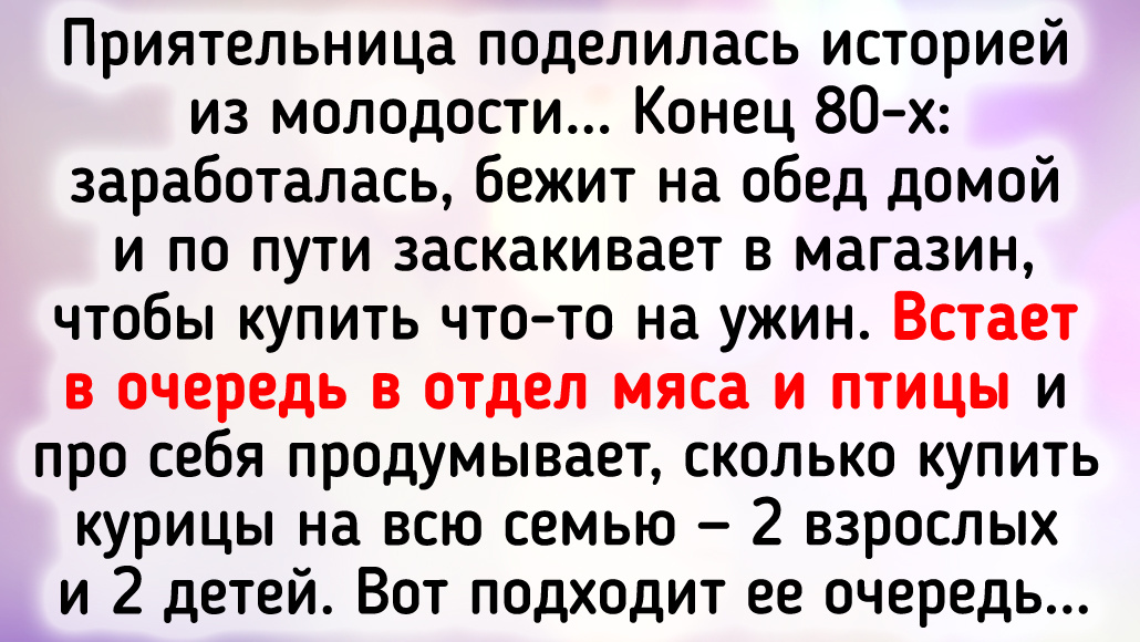 Приятельница поделилась историей из молодости. Конец 80-х: заработалась, бежит на обед домой и по пути заскакивает в магазин, чтобы купить что-то на ужин. Встает в очередь в отдел мяса и птицы и про себя продумывает, сколько купить курицы на всю семью — 2 взрослых и 2 детей. Подходит ее очередь, говорит: