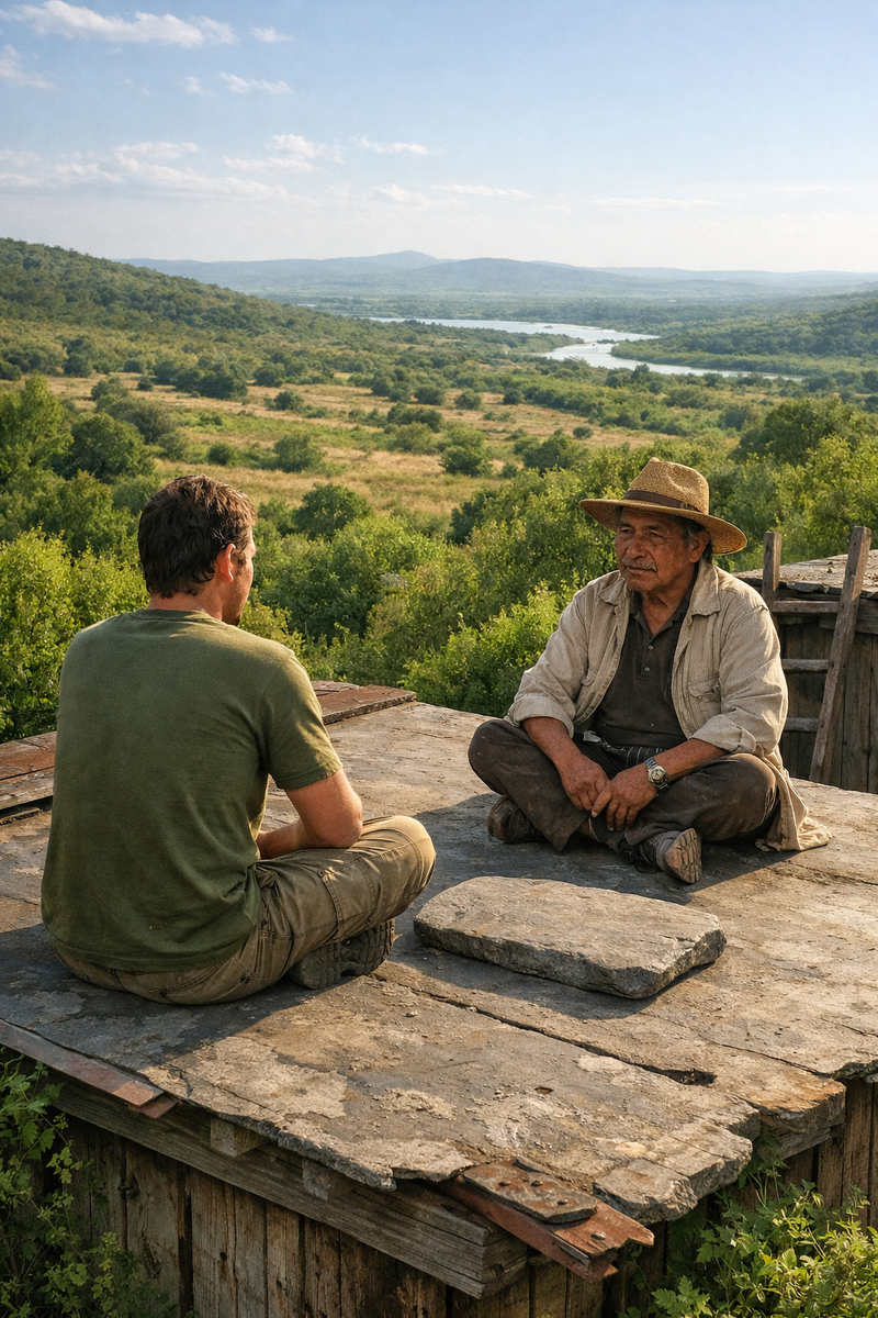 Мы сидели на плоской крыше заброшенного сарая, откуда была видна почти вся долина — серые пятна кустарника, рыжие проплешины выгоревшей травы, и где-то далеко, у самого горизонта, блестящая нитка реки, которую Хенаро назвал «змеёй, которая спит, но видит сны». Дон Хуан пришёл позже, поднялся по приставной лестнице, которая шаталась, но он шагал по ней так, будто ступени были вырезаны в скале, — и сел напротив, положив между нами плоский камень, на котором ничего не было.