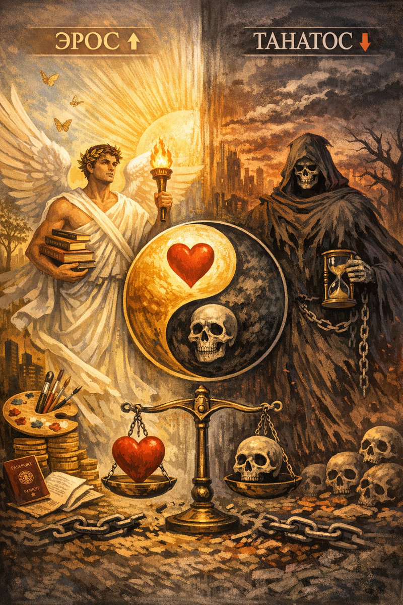 - Эрос и Танатос всегда стремяться к балансу, быть 1 к 1. И они автоматически уравновешивают друг друга.
