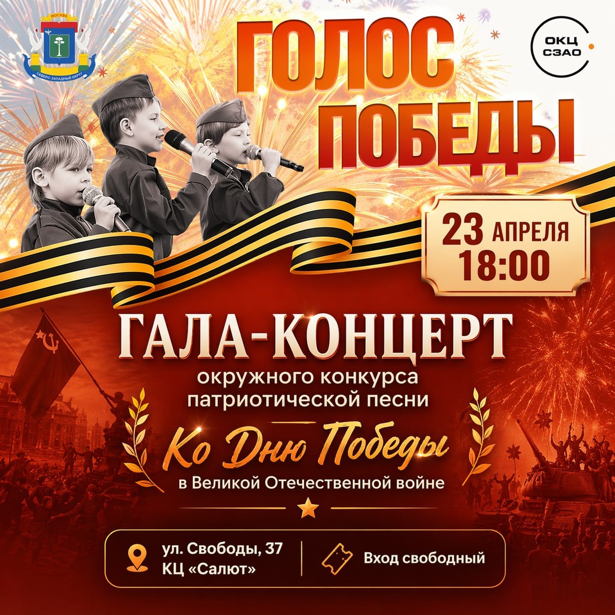 Символично, что во Всемирный день голоса мы анонсируем кульминацию нашего главного патриотического проекта. Голос — это не только инструмент вдохновения, но и живая связь поколений, звучащая в песне 🎶 ⭐️ В КЦ «Салют» 23 апреля состоится Гала-концерт и торжественная церемония награждения победителей конкурса патриотической песни «Голос Победы 2026» Этот конкурс проводится уже седьмой год, и каждый раз он доказывает, что в СЗАО живут невероятно талантливые люди. В этом году заявки подали более 100 участников из Москвы и Подмосковья. На гала-концерте выступят лучшие финалисты🎙 📍 Место: ул. Свободы, д. 37, КЦ «Салют» 📅 Дата: 23 апреля в 18:00 🎟 Вход свободный Приходите всей семьей, чтобы поддержать наших участников и вместе с ними прочувствовать атмосферу праздника и великой памяти 🇷🇺🤍 #ГолосПобеды #СЗАО #КультураСЗАО #ВсемирныйДеньГолоса #КЦСалют #Память #ТалантыМосквы