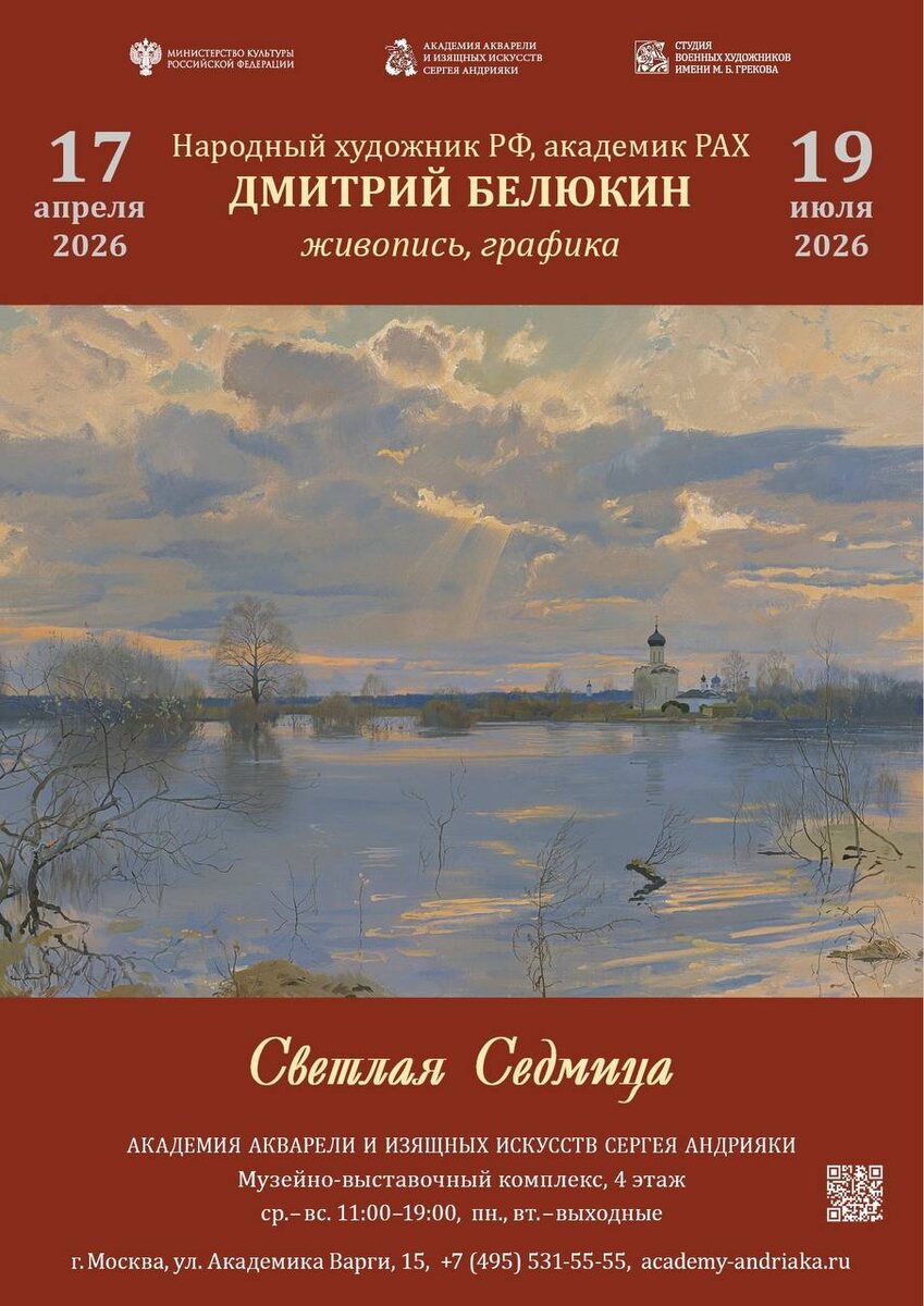 » 17.04- 19.07.2026 Академия акварели и изящных искусств Сергея Андрияки представляет выставочный проект одного из ведущих отечественных мастеров, народного художника РФ, академика РАХ, члена Студии военных художников им. М.Б. Грекова — Дмитрия Анатольевича Белюкина. Убеждённый приверженец традиций русской классической школы живописи, создавший за более чем 40-летний период своей творческой деятельности свыше тысячи произведений, он с успехом работает во всех видах изобразительного искусства: портрете, пейзаже, натюрморте, станковой графике, книжной иллюстрации и, что особенно важно, в редком, может быть, самом сложном жанре историко-тематической картины. Экспозиция, названная автором «Светлая седмица», продемонстрирует более 130 живописных полотен и графических листов художника.