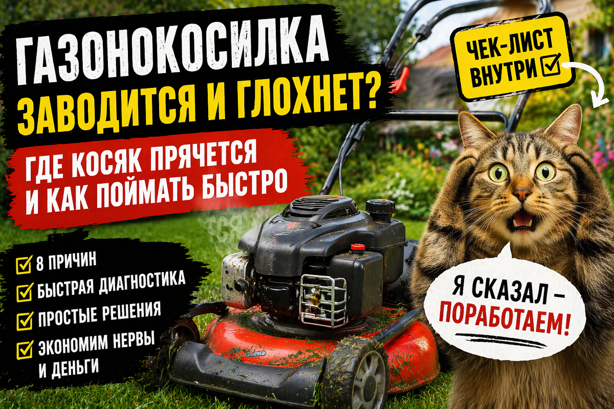Завёл газонокосилку, она бодро рыкнула, поработала пять секунд и сдохла. Дёрнул ещё раз — та же песня. И вот тут начинается цирк: кто свечу меняет, кто бензин доливает, кто уже мысленно тащит косилку “на диагностику”.