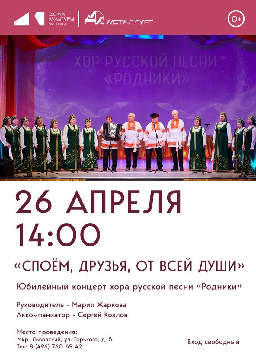 ✨ Хор русской песни «Родники» отмечает юбилей концертом «Споём, друзья, от всей души»! 🎙Целый вечер любимых песен, от которых на глазах выступают слезы радости, а ноги сами идут в пляс. 🚫 Возраст: 0+ 📆 26.04.2026 🕒 14:00 🏢 Дом культуры «Металлург» 📍 г.о. Подольск, мкр-н Львовский, ул. Горького, д. 5 💰 Вход свободный❗️ ⭐Поддержать канал голосом 🍰Где поесть в Подольске ✅ Мероприятия Подольск https://dzen.ru/id/66ed500f7b5671493eca3fd6 https://vk.ru/podolsk_events http://dzen.ru/podolsk_events