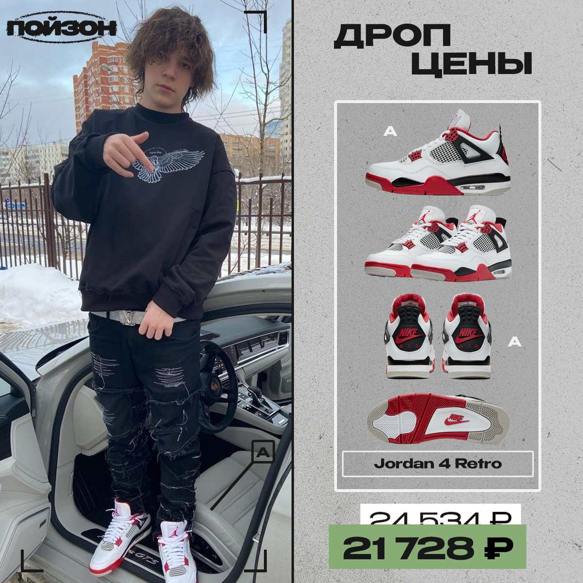19-летний рэпер уже раздает стиль — чарты рвутся, поклонники ликуют, кроссовки покупаются. За выбор Jordan 4 Retro отдельный лайк. Айтем в «Дроп ценах», стоимость актуальна только сегодня. Jordan 4 Retro, цена от 21 728₽* (вместо 24 534₽) *стоимость может изменяться в зависимости от курса и размера Больше интересного на нашем сайте POIZON