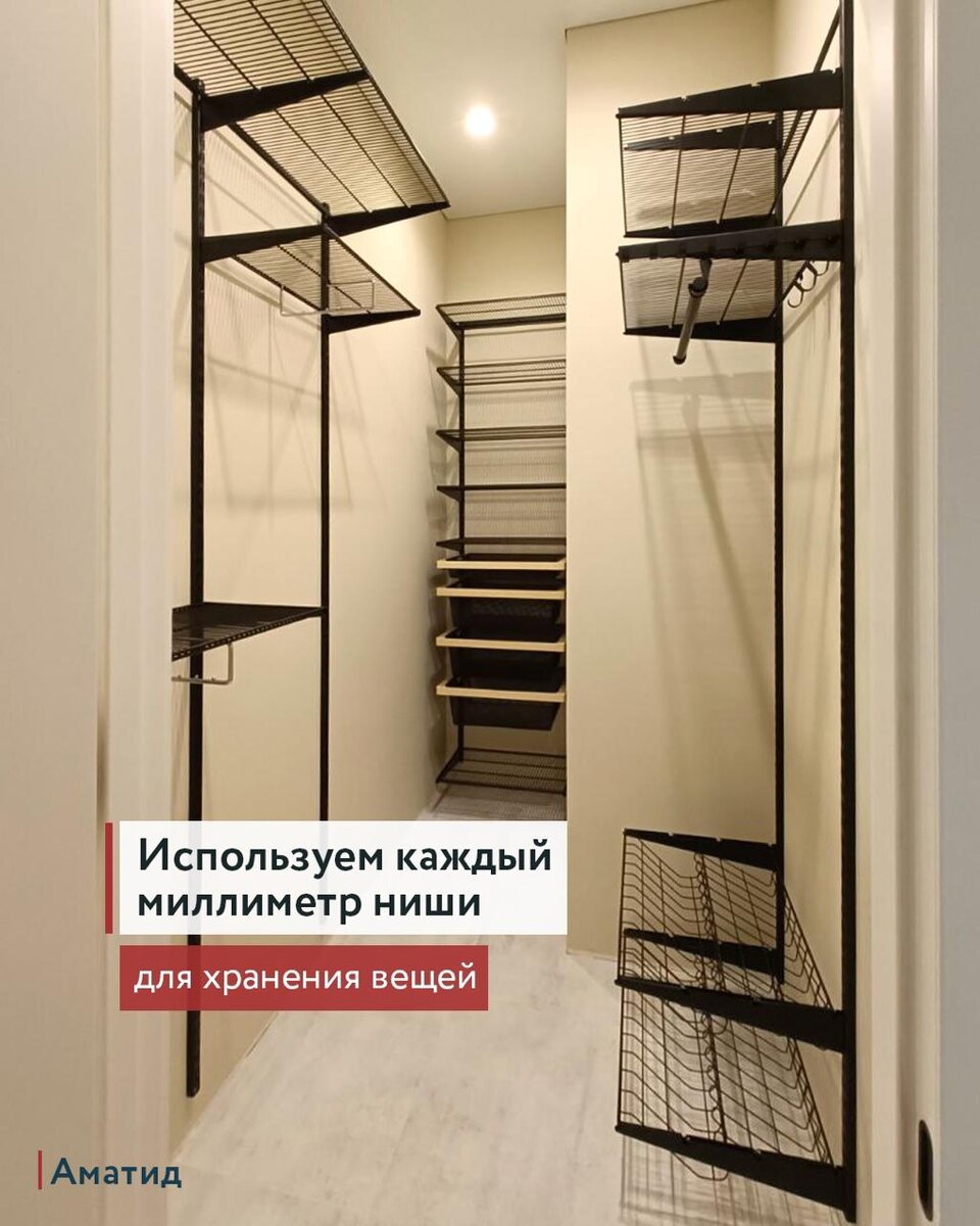 💫 Ваша комната имеет необычную форму или сложную планировку, например, с мансардным потолком? Не переживайте — мы знаем, как сделать систему хранения эргономичной и вместительной. Наши работы подходят для установки даже в сложных пространствах, потому что легко адаптируются под любые размеры и формы 💫 С сетчатым наполнением можно использовать каждый сантиметр: такие системы не требуют глубоких полок — вместо этого можно создать многоуровневое хранение с открытым доступом к вещам. Например, в мансарде с наклонным потолком можно разместить полки по бокам, не создавая ощущения загроможденности, а в центре оставить место для хранения крупных вещей. 🧡 Каждая деталь нашей гардеробной системы подбирается индивидуально, чтобы вписаться в вашу планировку и обеспечить удобный доступ ко всем вещам. 🧡 Напишите нам, и мы разработаем гардеробную, которая идеально подойдет для вашего дома. •Консультируем здесь @Amatidru •Или по тел.: +79219170608 •3 салона СПб, монтажные бригады СПб и Мск •