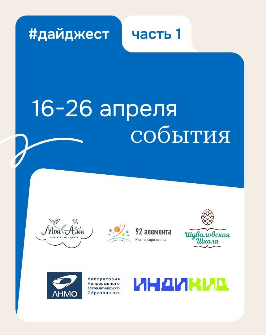 : • 16 апреля День открытых дверей. Старшая школа. Все направления, 7-11 классы+бесплатное тестирование для учащихся Адмиралтейский район https://vk.cc/cWnA7E • 18 апреля День открытых дверей в Монтессори-школе «Мон Ами» Центр https://vk.cc/cWl62o • 18 апреля День открытых дверей в Шуваловской школе Выборгский район https://vk.cc/cWl5NT • 20 апреля День открытых дверей в Монтессори-резиденции «Мон Ами» Зелёная роща https://vk.cc/cWl6g7 • 20 апреля День открытых дверей в школе «ИндиКид» Крестовский остров https://vk.cc/cWl6lh • 21 апреля День открытых дверей в Монтессори школе «92 элемента» Петроградка https://vk.cc/cWEI7I
