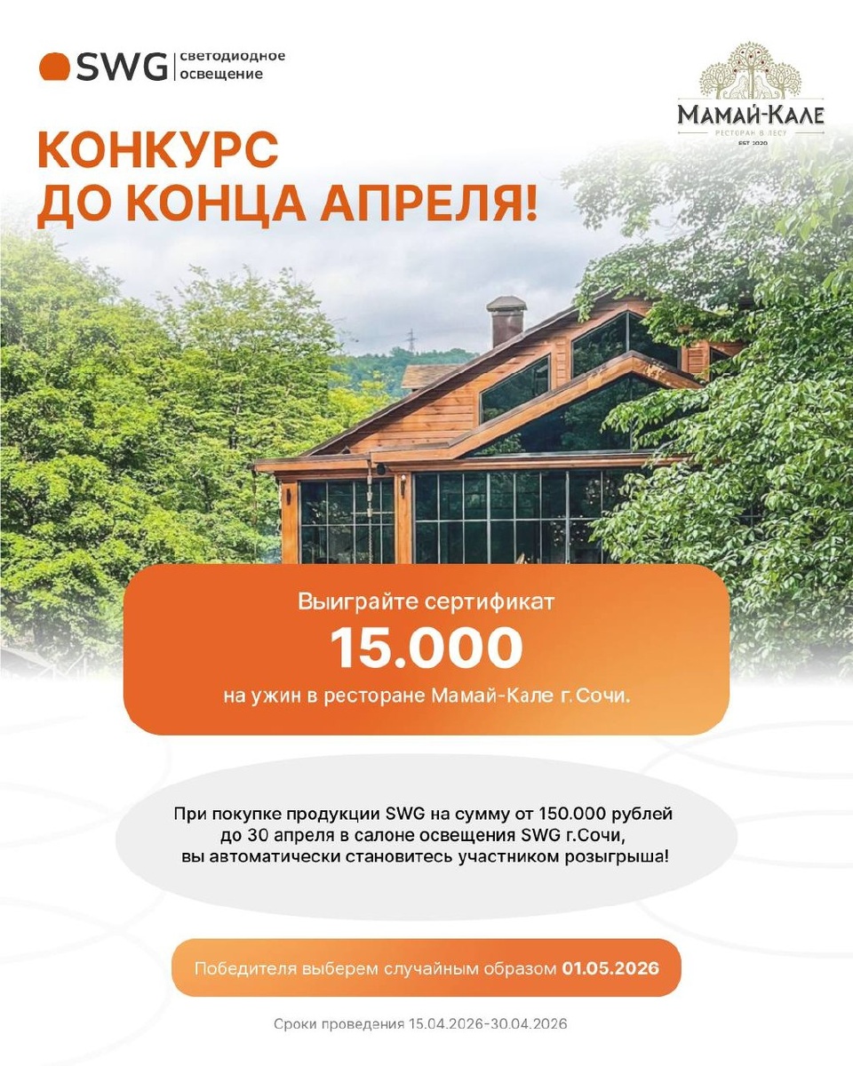 ! До конца апреля купите осветительное оборудование всего от 150 000 рублей и станьте участником розыгрыша ужина в ресторане «Мамай-Кале». Победителя выберем 1 мая. Подробности акции в Шоу-руме освещения SWG 📍Сочи , Пластунская 29 Интерьерный комплекс Панорама +7 (938) 471-67-27