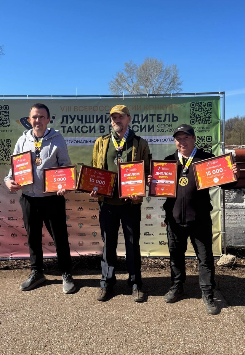🚕 16 апреля в Уфе водители такси со всего региона соревновались в знании ПДД, улиц и истории области. На практике участников ждало испытание на плавность вождения — пять стаканов воды на крыше автомобиля. 🥇 Ринат Даутов (81 балл) 🥈 Максим Гороховский (80 баллов) 🥉 Ринат Хатмуллин (79 баллов) Ринат впервые в истории представит Башкортостан на федеральном этапе, где лучшие водители со всей страны поборются за главный приз — автомобиль 🚗 Организатор — Общественный Совет по развитию такси при поддержке Министерства транспорта и дорожного хозяйства Республики Башкортостан. Благодарим партнеров! Генеральный партнер — сервис Яндекс Про Официальный партнер — сервис заказа такси «Максим» Генеральный партнер регионального этапа — АРТ МОТОРС Партнер конкурса — компания Технологии Страхования Следите за федеральным этапом — болеем за Рината! 💪