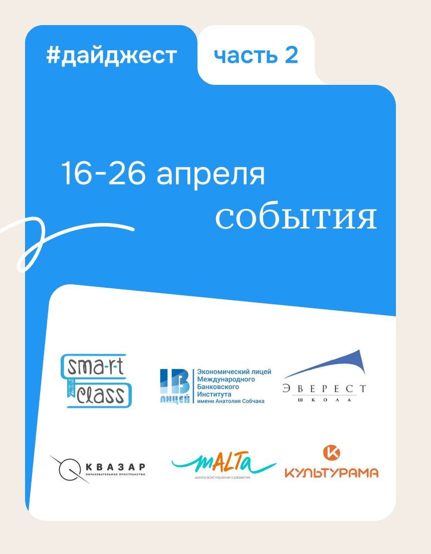 : • 21 апреля День открытых дверей. Семейная школа Мальта Центр https://vk.cc/cWJD8g • 22 апреля День открытых дверей в образовательном пространстве «Квазар» Московский район https://vk.cc/cWEIhR • 22 апреля День открытых дверей экономического лицея МБИ: погружение Центр https://vk.cc/cWEIxq • 23 апреля Вебинар-круглый стол «Онлайн-обучение в начальной школе: говорим откровенно» Выборгский район https://vk.cc/cWEIYl • 24 апреля День открытых дверей в школе Эверест Приморский район https://vk.cc/cWEJg0 • 24 апреля Родительский клуб – День открытых дверей образовательных проектов Культурамы Адмиралтейский район https://vk.cc/cWEJFF