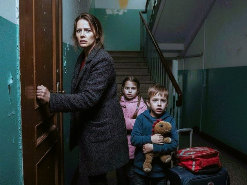 Голос Галины Петровны прозвучал глухо, но отчётливо — так, что эхо прокатилось по лестничной площадке. Тускло мигающая лампа выхватывала из полумрака силуэт женщины с двумя детьми и пакетом, из которого торчал рукав детской куртки. Рядом стоял чемодан, наспех застёгнутый, с торчащим углом простыни.
