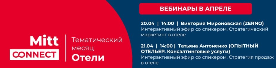 20 и 21 апреля пройдут интерактивные эфиры, где можно разобрать практические задачи, уточнить спорные моменты и получить ориентиры для дальнейшей работы. Для тех, кому удобнее смотреть в своем темпе, на платформе будет доступна запись. Поэтому участие можно спланировать так, как комфортно. Главное — заранее зарегистрироваться на MITT Connect. Эфир о стратегическом маркетинге 🙂Регистрация на эфир ✈️Задать вопрос про маркетинг Эфир о стратегии продаж в отеле 🙂Регистрация на эфир ✈️Задать вопрос о продажах Ждем вас, до встречи!