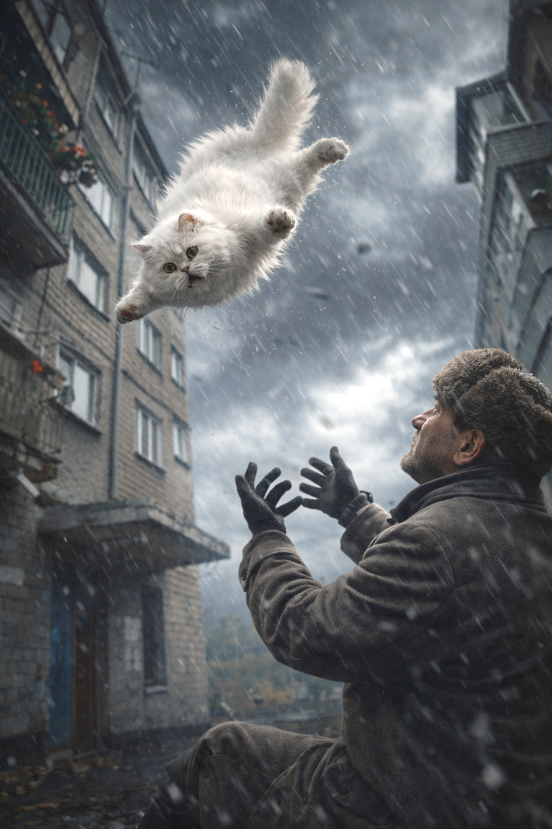 Его сорвало с карниза. Не постепенно, не с предупреждением в виде скольжения лап, а сразу. Чисто, технично, как пушинку с одуванчика. Фантик потерял опору и оказался в воздухе, в полёте, отнесённый резким толчком в сторону от спасительной стены дома. Белая шерсть взметнулась вверх, лапы разъехались в разные стороны, а в широко раскрытых янтарных глазах, возможно, впервые за всю его жизнь отразилось не лёгкое презрение, а самый настоящий ужас. Вернуться обратно к стене, зацепиться за что-то было уже невозможно физически. Фантика уносило в свободное падение.