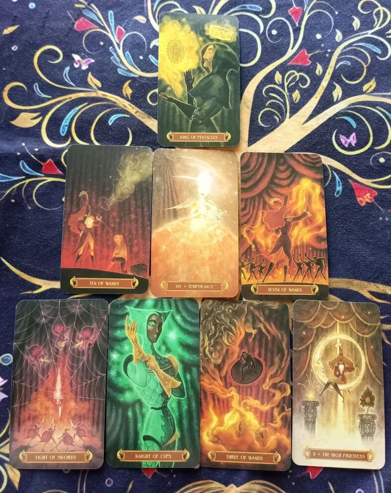 Этот расклад, словно карта сокровищ, привел вас к главному осознанию. Вы, Король Пентаклей, владелец этого цирка, остались не потому, что не можете уйти, а потому что задержались из-за иллюзий (8 Мечей) и эмоциональных привязанностей (Рыцарь Кубков). Вы защищали свою правду (7 Жезлов), в то время как вокруг вас царило ложное спокойствие (Умеренность), а само представление давно превратилось в непосильную ношу (10 Жезлов).