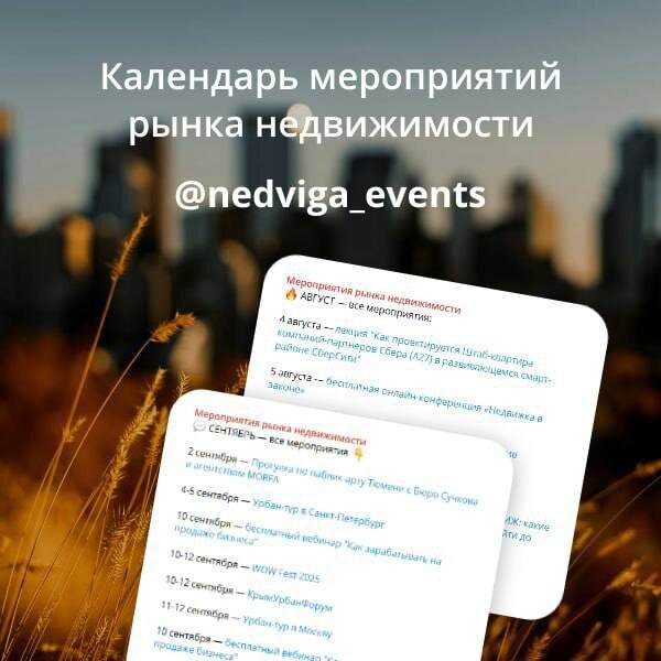 👋 @nedviga_events — здесь анонсы конференций, форумов, вебинаров, лекций и прямых эфиров — для риелторов, девелоперов, архитекторов, инвесторов, в общем, всех, кто связан с недвижимостью, строительством, проектированием. Если вы следите за событиями рынка, обязательно подпишитесь, чтобы не пропустить важные мероприятия. А если вы сами проводите мероприятия, вебинары или лекции, организуете конференции или курсы, пишите в сообщения канала, чтобы разместить анонс.