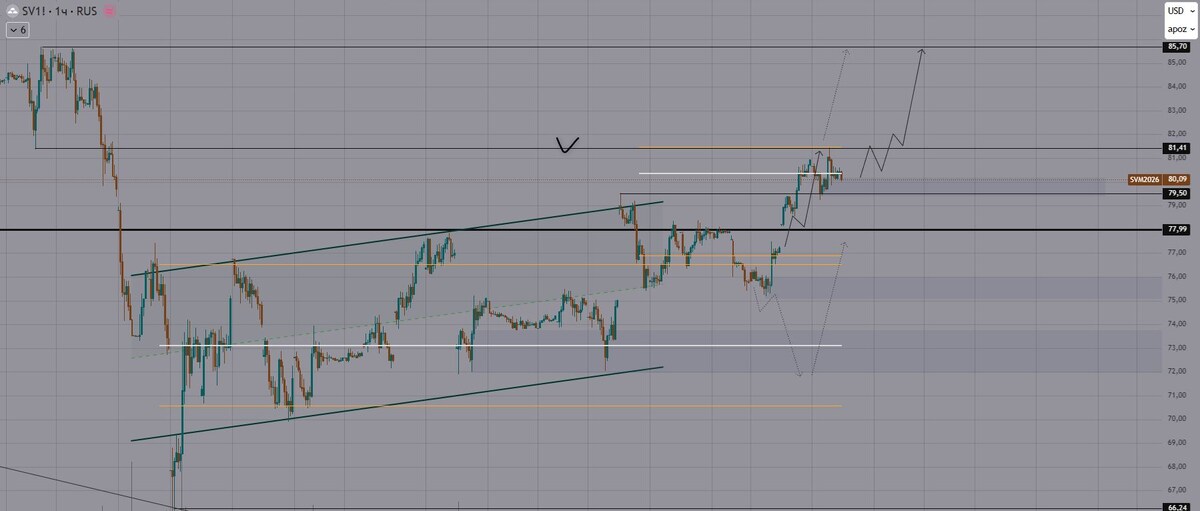 На прошлом обзоре по Серебру сценарий по длинной позиции достиг первой цели.☑️ Текущая ситуация выглядит позитивно для продолжения лонгового сценария. Пробитие сопротивления и выход из диапазона являются сильными бычьими сигналами. Уровень 81,41 является ключевым. Его закрепление сверху подтвердит силу быков и откроет путь к дальнейшему росту. Перед дальнейшим ростом может произойти небольшая коррекция или тестирование уровня поддержки ОВ либо на уровень диапазона 77,99Это нормальный процесс после Основной риск заключается в случае, если цена не сможет закрепиться выше 81,41 и начнет снижаться, пробивая уровень поддержки. При благоприятном развитии событий, когда цена закрепится выше 81,41, можно ожидать продолжения восходящего движения с достижением новых целей. На графике показаны возможные дальнейшие движения цены, которые предполагают рост. 🔵Соблюдайте риски 🔵Не является ИИР 📺 MAX 📹 rutube.ru 📈Telegram
