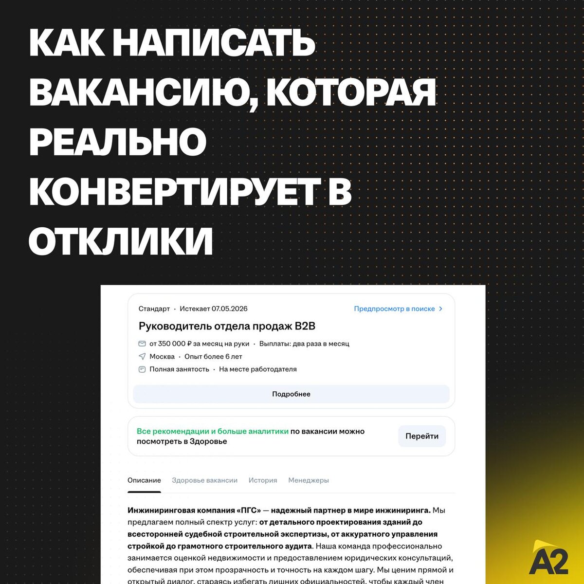 Мы знаем, что в нашем канале есть собственники, которые сами занимаются наймом, - поэтому для вас держите первые советы по созданию рабочей вакансии. Если пройтись сейчас по рынку, 80-90% вакансий - это просто мрак. Парадокс: кандидаты давно научились идеально вылизывать резюме, а работодатели пишут объявления как в 2005-м. И потом удивляются, почему нет откликов. 1. Название вакансии Самое недооценённое место. Оно должно быть таким, чтобы кандидат узнавал в нём себя. Никаких «Евангелистов роста» и «Капитанов клиентского счастья» - нормальный человек это не ищет в поиске. Изучите рынок кандидитов на hh, посмотрите, как кандидаты сами себя называют в резюме, - и отталкивайтесь от этого. 2. Описание компании - 2 предложения Чем занимаетесь, какой профиль, как котируетесь на рынке. Главное - твёрдые цифры: возраст компании, количество клиентов, конкретные результаты. Не «лидер рынка», а «работаем с 2015 года, 150+ клиентов». Цифры цепляют, эпитеты - не очень. 3. Роль в компании - 1-2 п