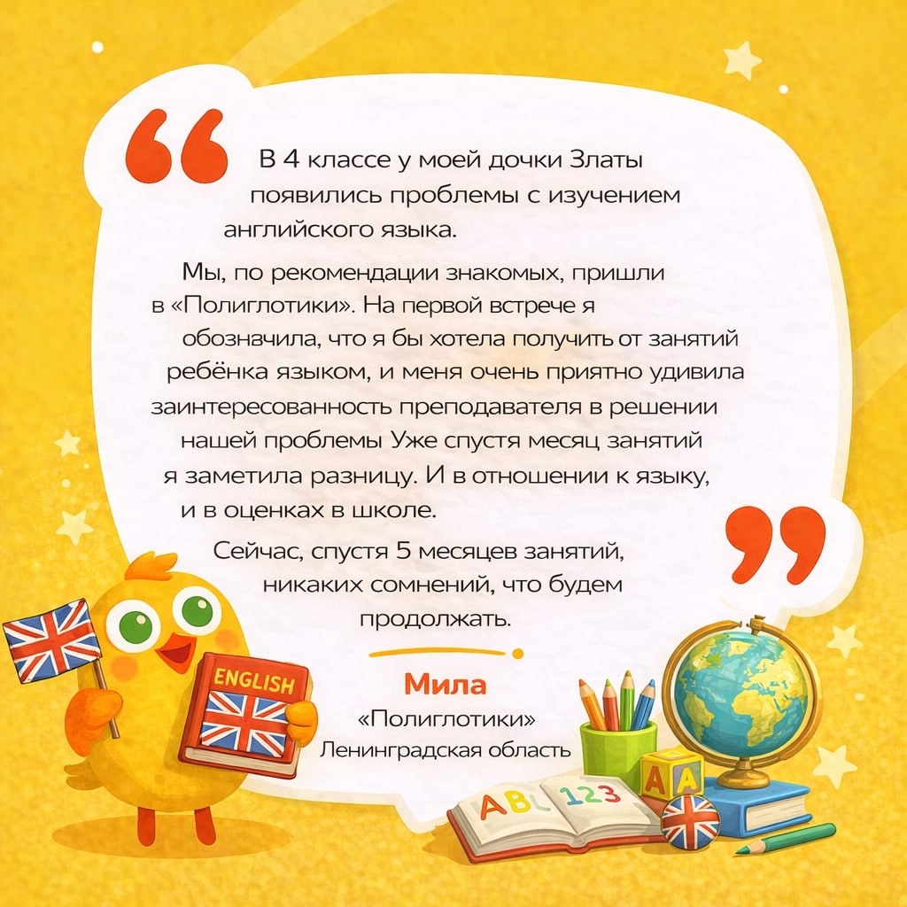 Β» Π‘Π΅Π³ΠΎΠ΄Π½Ρ β ΠΈΡΡΠΎΡΠΈΡ ΠΈΠ· ΠΠ΅Π½ΠΈΠ½Π³ΡΠ°Π΄ΡΠΊΠΎΠΉ ΠΎΠ±Π»Π°ΡΡΠΈ. ΠΠΎΠ³Π΄Π° Ρ ΡΠ΅Π±ΡΠ½ΠΊΠ° Π²ΠΎΠ·Π½ΠΈΠΊΠ°ΡΡ ΡΠ»ΠΎΠΆΠ½ΠΎΡΡΠΈ Ρ ΡΠ·ΡΠΊΠΎΠΌ, Π²Π°ΠΆΠ½ΠΎ Π½Π΅ ΠΏΡΠΎΡΡΠΎ Β«ΠΏΠΎΠ΄ΡΡΠ½ΡΡΡ ΠΎΡΠ΅Π½ΠΊΠΈΒ», Π° Π²Π΅ΡΠ½ΡΡΡ ΠΈΠ½ΡΠ΅ΡΠ΅Ρ ΠΈ ΡΠ²Π΅ΡΠ΅Π½Π½ΠΎΡΡΡ. ΠΠΌΠ΅Π½Π½ΠΎ ΡΡΠΎ ΠΈ ΠΎΡΠΌΠ΅ΡΠ°ΡΡ ΡΠΎΠ΄ΠΈΡΠ΅Π»ΠΈ: Π²Π½ΠΈΠΌΠ°ΡΠ΅Π»ΡΠ½ΠΎΠ΅ ΠΎΡΠ½ΠΎΡΠ΅Π½ΠΈΠ΅ ΠΏΡΠ΅ΠΏΠΎΠ΄Π°Π²Π°ΡΠ΅Π»Ρ, ΡΠ°Π±ΠΎΡΠ° Ρ Π·Π°ΠΏΡΠΎΡΠΎΠΌ ΡΠ΅ΠΌΡΠΈ ΠΈ ΡΠ΅Π°Π»ΡΠ½ΡΠ΅ ΡΠ΅Π·ΡΠ»ΡΡΠ°ΡΡ ΡΠΆΠ΅ ΡΠ΅ΡΠ΅Π· ΠΊΠΎΡΠΎΡΠΊΠΎΠ΅ Π²ΡΠ΅ΠΌΡ. Π Π΄Π°Π»ΡΡΠ΅ β ΡΡΠ°Π±ΠΈΠ»ΡΠ½ΡΠΉ ΠΏΡΠΎΠ³ΡΠ΅ΡΡ ΠΈ ΠΆΠ΅Π»Π°Π½ΠΈΠ΅ ΠΏΡΠΎΠ΄ΠΎΠ»ΠΆΠ°ΡΡ. Π‘ΠΏΠ°ΡΠΈΠ±ΠΎ Π·Π° Π΄ΠΎΠ²Π΅ΡΠΈΠ΅ π π€©π€©π€©