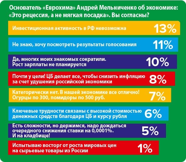 Результаты ПЛАС-Опроса от 14 апреля Публикуем результаты ПЛАС-Опроса, проведенного PLUSworld c 30 марта по 14 апреля 2026 года в нашем Телеграм-канале. Напоминаем, мы задавали вопрос: «Основатель «Еврохима» Андрей Мельниченко об экономике: «Это рецессия, а не мягкая посадка». Вы согласны?» Итак, 13% опрошенных, отвечая на вопрос, согласны ли они с оценкой ситуации в российской экономике «Это рецессия, а не мягкая посадка», указали на невозможность инвестиционной активности в РФ. На сокращения в компаниях и отсутствие роста зарплаты пожаловались 10% респондентов. А 8% считают, что ЦБ делает все, чтобы снизить инфляцию за счет удушения российской экономики. Высокую стоимость денежных средств как ключевую причину экономических трудностей назвали 6% читателей, виновником они также видят ЦБ и курс рубля (что в нашем случае практически одно и тоже). Наконец, в общей сложности 12% опрошенных выразили, несмотря на формальную позитивность своих ответов, горькую иронию. «В нашей экономике