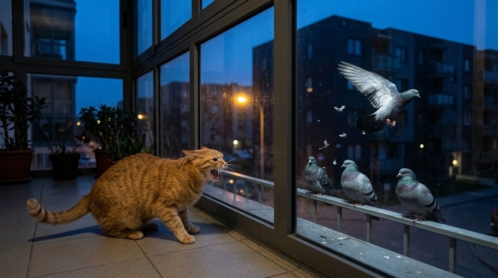 Началось всё с голубей. Их на районе – тьма. Жирные, наглые, они облепляют карнизы и воркуют так, будто это их законная квартира. Персик, когда видит их с балкона, впадает в ярость. Он припадает к земле, уши в трубочку, хвост дёргается. И потом – ор.