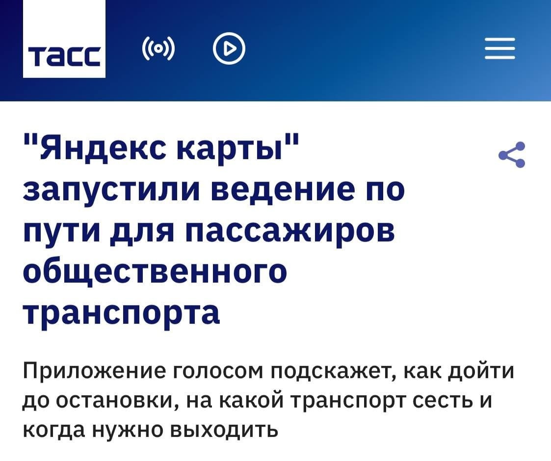 В Яндекс Картах появилось новое поколение навигации для общественного транспорта. Приложение голосом подсказывает маршрут до нужной остановки или станции и сообщает, когда выходить. В маршруте также доступны дополнительные детали, например, рекомендации по выбору вагона метро. Функция работает в фоновом режиме на заблокированном экране. Аналогичной функции нет ни в других российских сервисах, ни в Google Maps. https://dzen.ru/id/5c0e38ff46ef5c00aaa80527