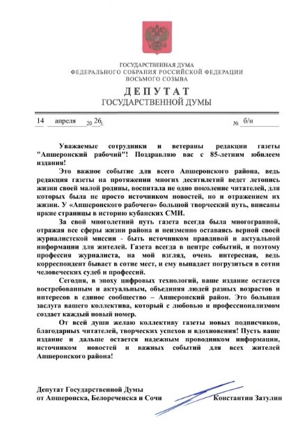 «Это важное событие для всего Апшеронского района, ведь редакция газеты на протяжении многих десятилетий ведет летопись жизни своей малой родины, воспитала не одно поколение читателей, для которых была не просто источником новостей, но и отражением их жизни. У «Апшеронского рабочего» большой творческий путь, вписаны яркие страницы в историю кубанских СМИ.