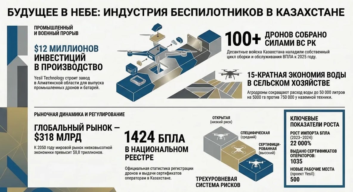 🇰🇿 ► Казахстан демонстрирует колоссальный интерес к беспилотным технологиям. По данным аналитических отчетов, рост импорта электрических БПЛА в период с 2023-го по 2024 год составили беспрецедентные 22 000%. Это свидетельствует о резком скачке спроса со стороны как государственных, так и частных структур. ► Мировой рынок БПЛА оценивается в сотни миллиардов долларов. По прогнозам, к 2050 году его объем может превысить $8,8 трлн. ► Казахстан, обладающий огромной территорией и низкой плотностью населения, может стать идеальной площадкой для масштабирования этих технологий. ‼️Основные заказчики Хотя в последнее время для многих беспилотник ассоциируется лишь с военной техникой, в Казахстане основными заказчиками БПЛА выступают крупные агрохолдинги и компании добывающего сектора ➡️Сельское хозяйство: ⚫️Традиционные опрыскиватели расходуют около 150 литров воды на гектар, тогда как беспилотник справляется, используя всего 10 литров, что означает 15-кратную экономию воды ⚫️Использова