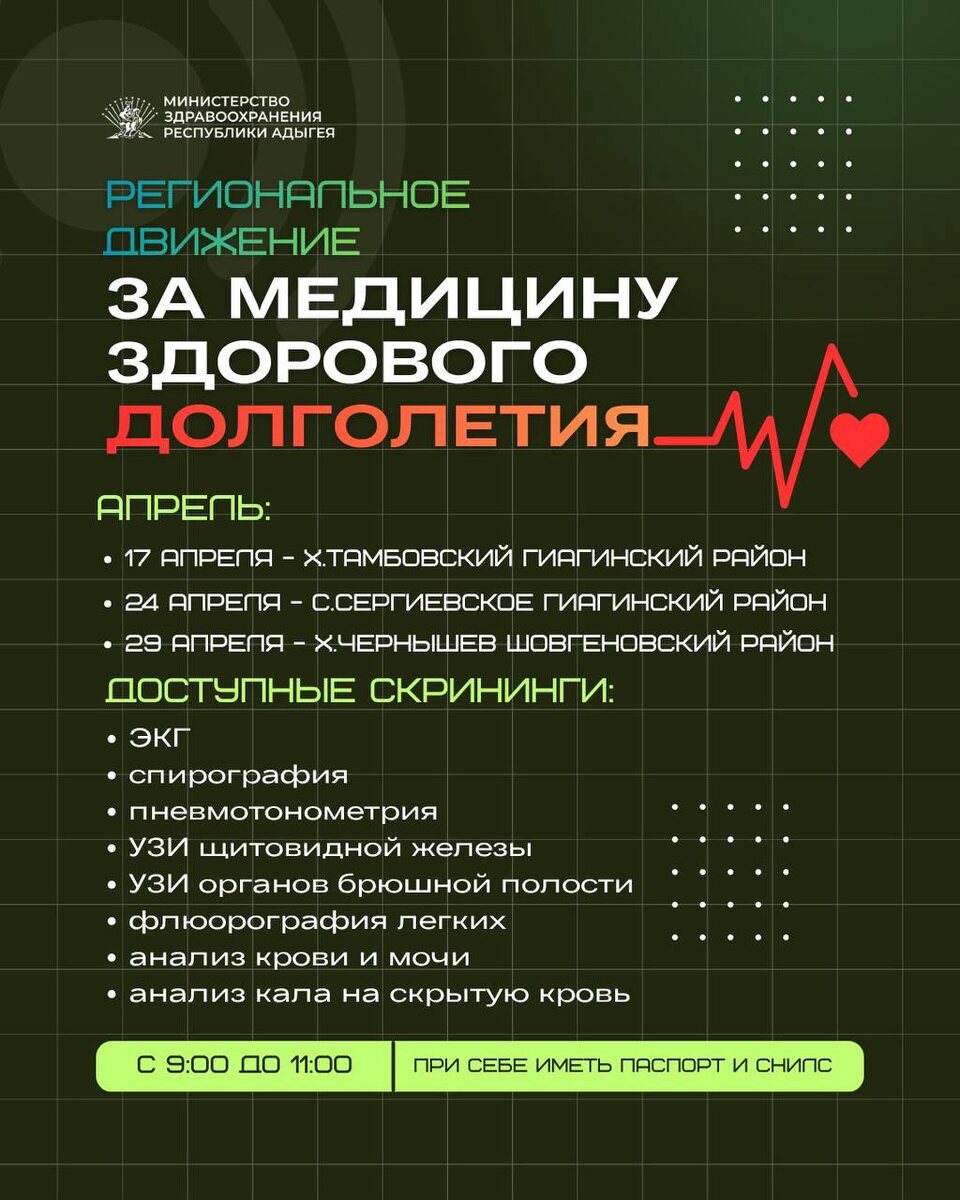 ! Региональное движение «За медицину здорового долголетия» стартовало в Адыгее в конце прошлого года, чтобы помочь людям сохранить здоровье и увеличить продолжительность жизни. Проект объединил медицину, культуру, СМИ, общественные организации и волонтёров. До конца апреля участники движения посетят населённые пункты Шовгеновского и Гиагинского районов. Смотрите карточку 💬 Присоединяйтесь к проекту вместе с нами и будьте здоровы! 💬Минздрав Адыгеи в МАХ