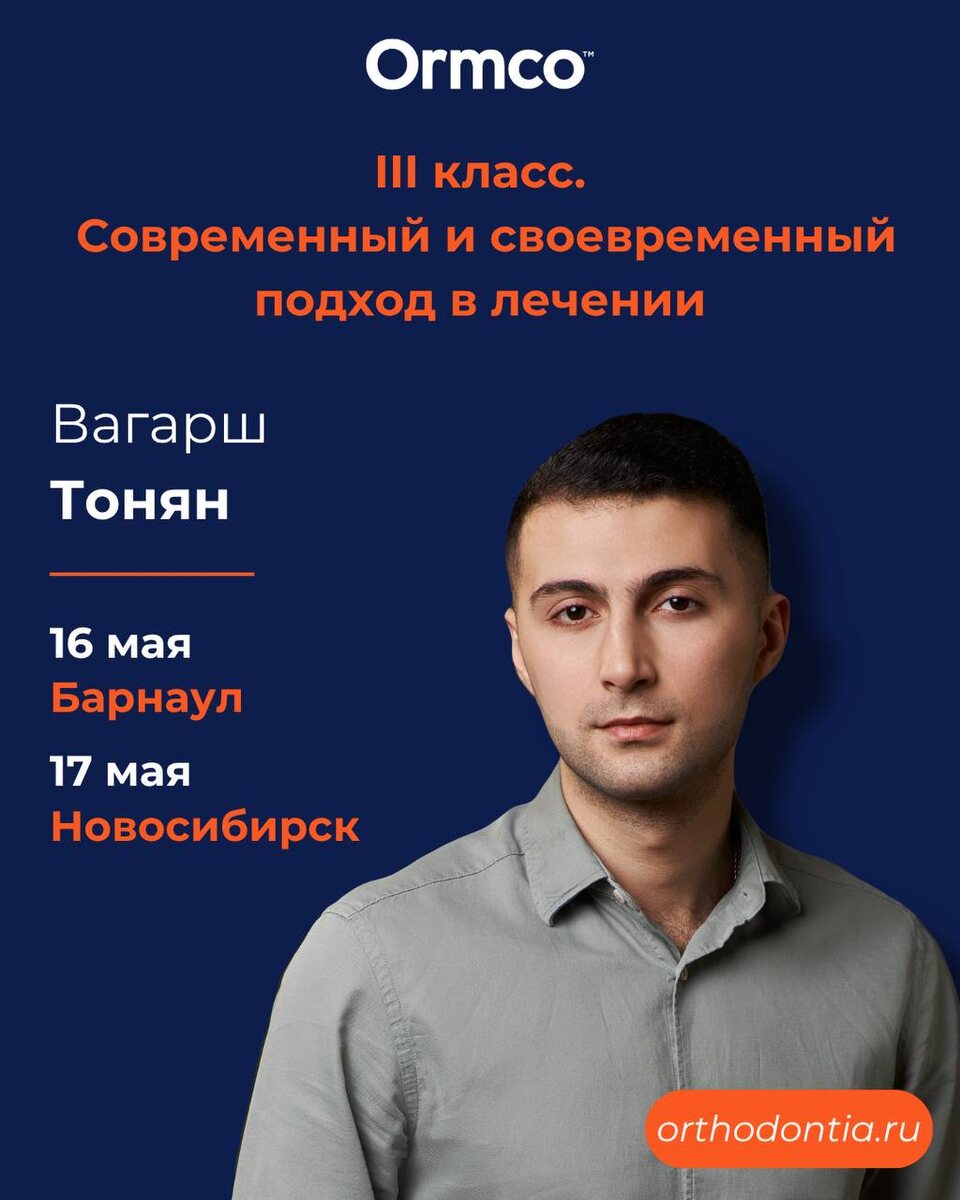 Современный и своевременный подход в лечении», который проведёт Тонян Вагарш Овикович. Программа курса: 🔹День 1 – лечение взрослых — Мезиальный прикус: этиология и распространенность; — Факторы, влияющие на развитие мезиального прикуса; — Диагностика и планирование; — Возможна ли компенсация при III классе и что на это влияет; — Хирургический подход в лечении мезиального прикуса; — Различные подходы в лечении и биомеханика: - лечение с удалением; - лечение с опорой на минивинты; - подробный разбор эластиков. 🔹День 2 – лечение детей и подростков — Диагностика и планирование: нюансы, оценка стадии роста и созревания небного шва; — Когда начинать и когда уже стоит подождать; — Функциональный III класс (ложный); — Лечение: - RPE+FM; - MARPE+FM; - MARPE+FM+Miniplates; - разбор съемных аппаратов; - функциональные аппараты. Даты и города: 📍16 мая 2026 г. — г. Барнаул Стоимость: 18.000₽ Скидка: для ординаторов - 30%, для членов ПОО - 15%, для участников ШО - 50%, врачам 1-2 года пра