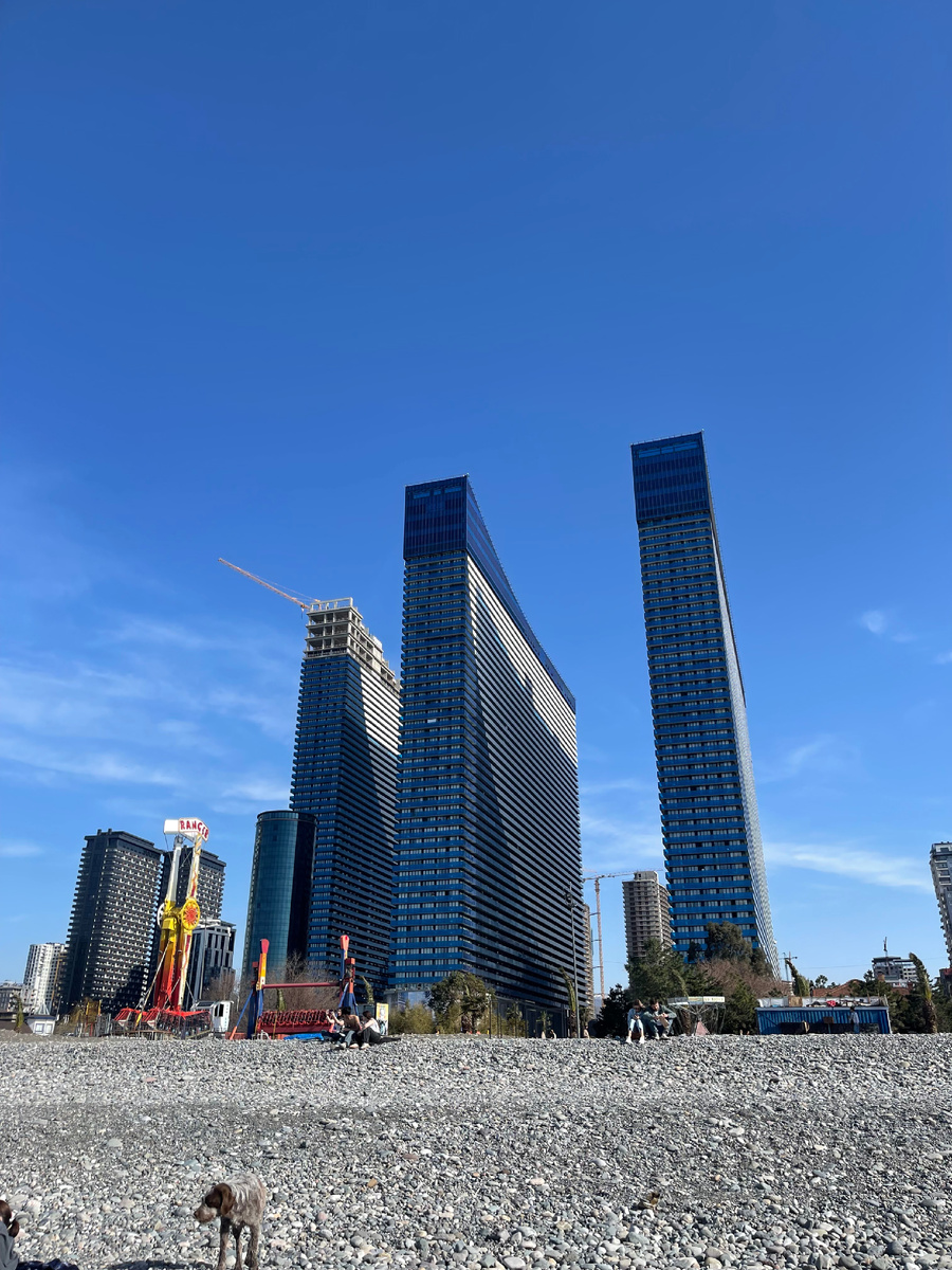Таксист высадил нас у первой. Заходим - такой брони нет. Оказалось, в каждой башне свой ресепшен. В первой долго что-то проверяли, просили подождать. Мы не стали сидеть - пошли к морю. Просто постояли на гальке, посмотрели на воду. Галька крупная, лежать на ней не тянет, а вот гулять - самое то.