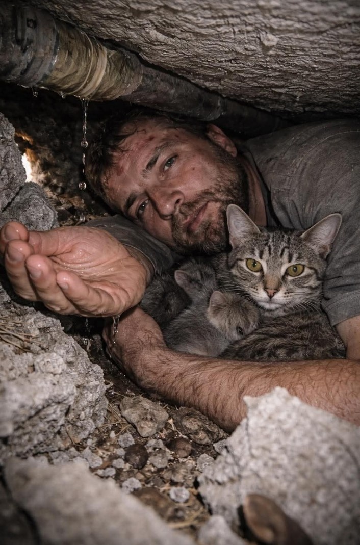 Д-р Джеймс Корбетт, 34 года, был врачом скорой помощи из Бостона, добровольцем в маленькой клинике в районе Карфур, когда в 16:53 произошло землетрясение. Двухэтажная бетонная конструкция обрушилась. Джеймс был на первом этаже. Ему на ноги упала плита — прищемила, но не раздавила их. Он был в сознании. Он оказался в ловушке в пространстве шириной примерно четыре фута и высотой два фута. "12 января 2010 года землетрясение 7.0 обрушило медицинскую клинику в Порт-о-Пренсе, на Гаити. Он мог видеть дневной свет через трещину слева. Из-за обломков справа от него мог услышать плач кота. Он правильно копал. Он нашел кошку-мать и двух котят в пустоте. Он поддерживал их живыми в течение 67 часов с водой из прорванной трубы, делился своим единственным запасом с кошкой, пока спасательные команды искали. Когда его вытащили, он держал кошку. Первое, что он сказал, было: «Вытащите ее первой" .Слева от него: трещина в обломках. Дневной свет. Воздух. Если бы он мог его расширить, то мог бы дотянуться