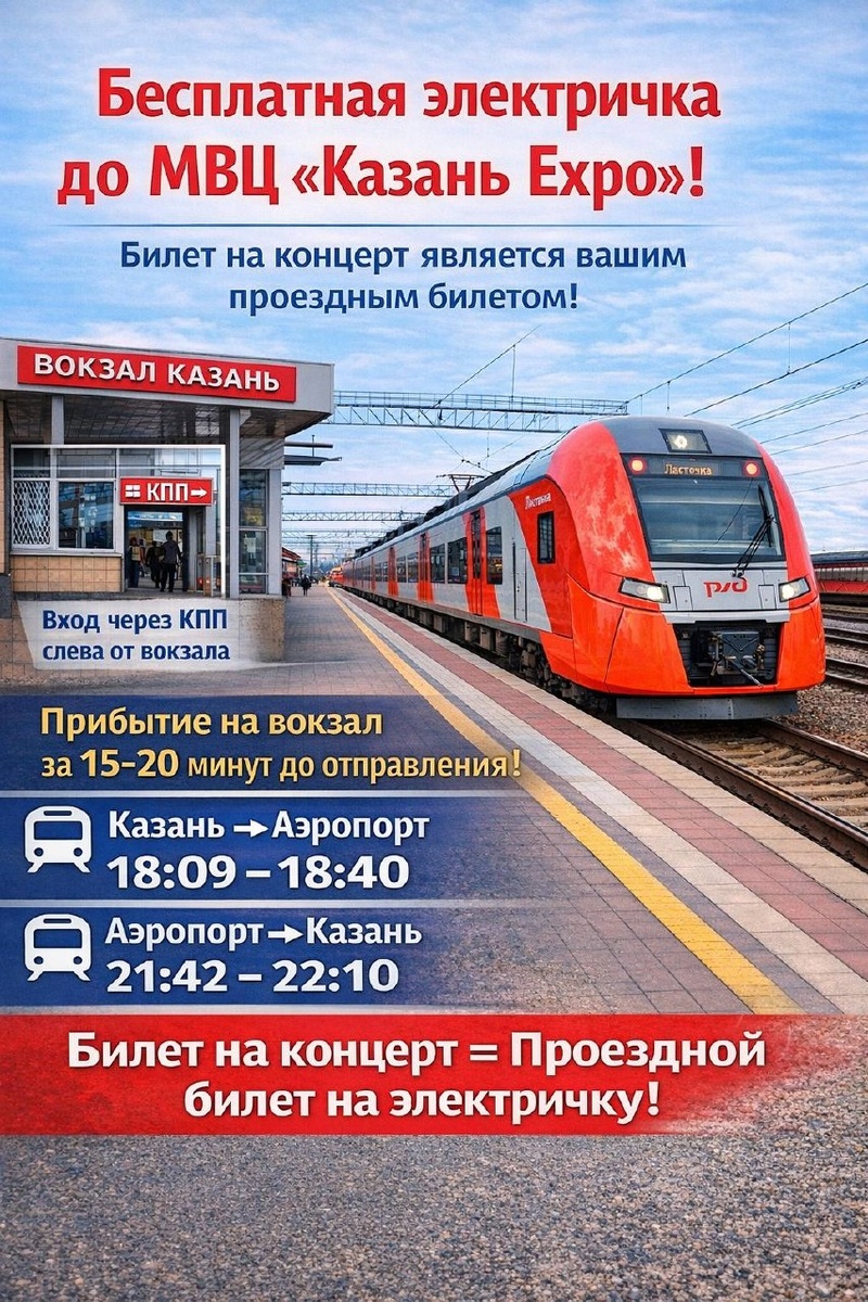 До места проведения концерта МВЦ «Казань Expo» вы сможете доехать бесплатно на электричке «Казань-Аэропорт