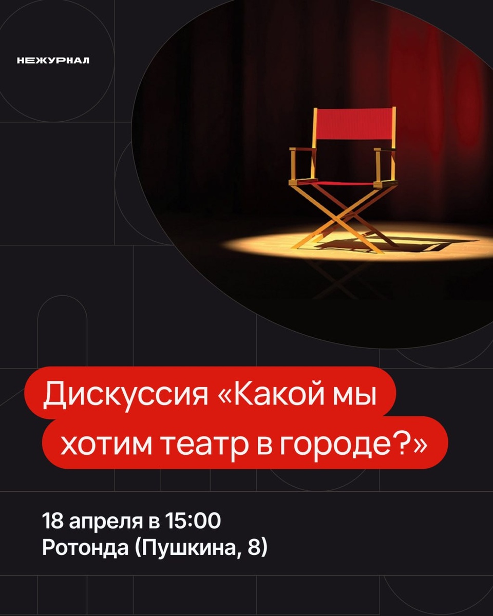 завтра Поговорим о том, каким должен быть современный городской театр, чего сегодня не хватает зрителю и труппам, как сделать театр частью повседневной городской жизни, а не «праздником раз в год». Модератор — Алексей Ремыга, продюсер медиа «Не журнал». 🕒 18 апреля в 15:00 встречаемся на Пушкина, 8. Вход свободный, по регистрации на сайте «Театрально!». 📰 Подпишись на «Не журнал» | Поддержать донатом