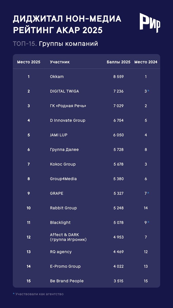 немедийных услуг. ТОП-15 лидеров среди агентств: 🥇 Okkam Creative 🥈 TWIGA INTERACTIVE 🥉 MOSAIC 4 Realweb 5 Hate Agency 6 OMD Спецпроекты (OMD FUSE) 7 DIDENOK TEAM 8 19agency84 9 CreativePeople 10 Артикс 11 emg 12 Out Digital 13 Adventum 14 SOCIALIST 15 Ingate ТОП-15 2025 среди групп компаний: 🥇 Okkam 🥈 DIGITAL TWIGA 🥉 ГК «Родная Речь» 4 D Innovate Group 5 JAMI LUP 6 Группа Далее 7 Kokoc Group 8 Group4Media 9 GRAPE 10 Rabbit Group 11 Blacklight 12 Affect & DARK (группа Игроник) 13 RQ agency 14 E-Promo Group 15 Be Brand People Рейтинг разработан Комитетом Digital-агентств АКАР и Аналитическим центром Российской индустрии рекламы. Результаты 2024 года представлены в соответствии с прежней методологией. 🌟 Подробности — на сайте 🔜 РИР — чтобы быть в курсе