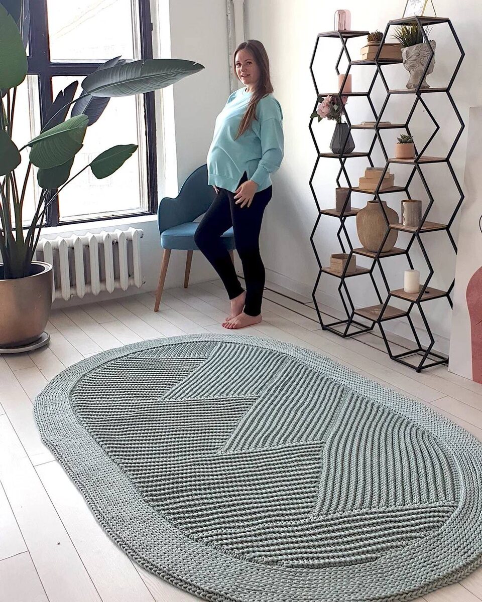 Мне хотелось точно попасть в задуманную форму, поэтому я сначала расчертила всё на миллиметровой бумаге, а потом уже вязала по своему шаблону Для меня это был очень интересный опыт. Сначала идея на бумаге, потом расчеты, а потом постепенно из шнура появляется настоящий ковер И у этого мастер-класса есть еще одна особенность 🙂 Снимала я его уже в положении, когда живот был совсем не маленький, так что процесс получился с дополнительными приключениями 😄 Но тем теплее у меня воспоминания об этом МК На фото как раз кусочек закулисья: выкройка, расчеты и сам ковер в работе. Такое я показываю нечасто, а ведь за каждым дизайном всегда стоит не только вдохновение, но и путь от идеи до готового результата Мне самой до сих пор нравится, как из задумки на бумаге получился вот такой ковер 💛