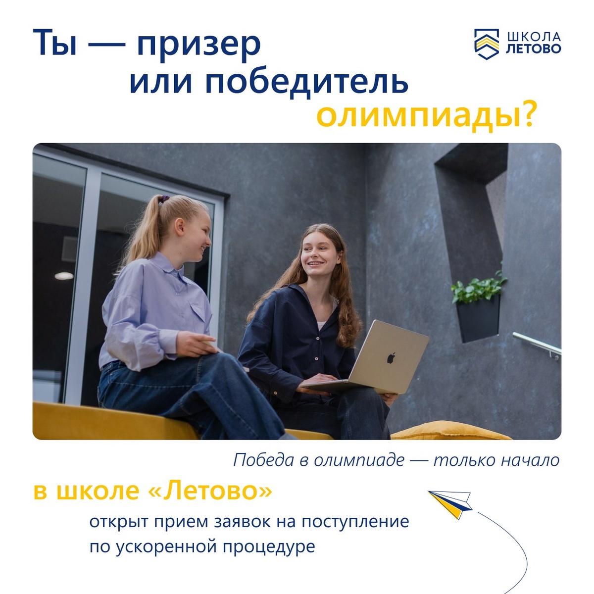 Если у вас есть диплом победителя или призера олимпиады за текущий или предыдущий учебный год, вы можете поступать в «Летово» по ускоренной процедуре. Подойдут дипломы ВсОШ, «Высшей пробы», «Ломоносова», олимпиады «Покори Воробьевы горы», МОШ и многих других — список зависит от предмета и профиля. А по английскому языку учитываются сертификаты от уровня B1. В школе «Летово» ученикам доступно более 100 внеакадемических направлений, а около 80% семей получают стипендии на обучение. Узнать о поступлении и подать заявку по ссылке.