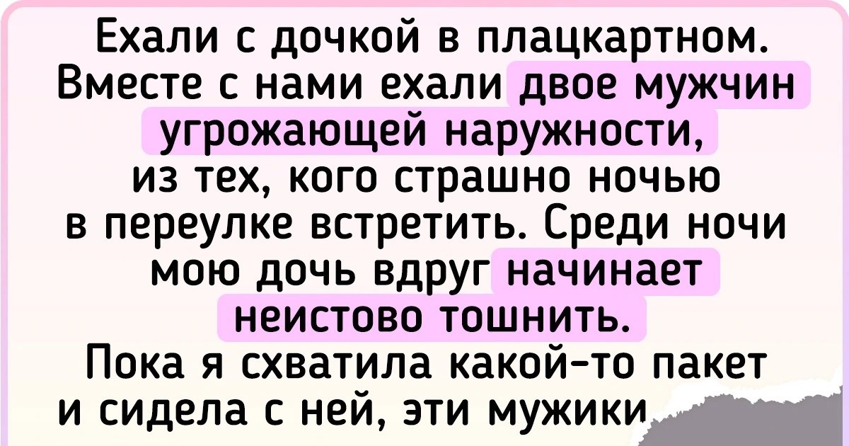 Ехали с дочкой в плацкартном. Вместе с нами ехали двое мужчин угрожающей наружности, из тех, кого страшно ночью в переулке встретить. Среди ночи мою дочь вдруг начинает неистово тошнить. Пока я схватила какой-то пакет и сидела с ней, эти мужики молча встали, куда-то ушли. Вернулись через 5 минут, один — с тряпкой и ведром, второй — с бутылкой воды и пакетом «Регидрона».