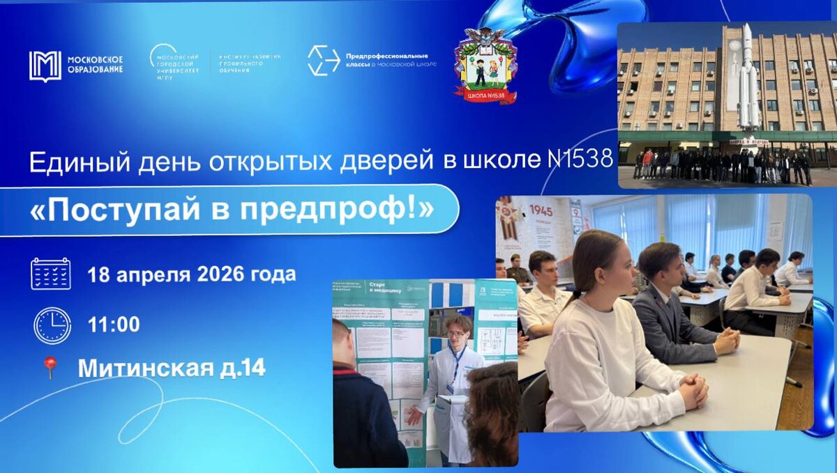 ! 📅 18 апреля 2026 года 🕚 11:00 📍 Митинская, 14 🚀 В этот день вся Москва открывает двери, и школа 1538 приглашает именно тебя — в 10–11 классы! 💡 Если ты задумываешься о будущем, выбираешь профессию и хочешь учиться с интересом и смыслом — тебе к нам. 10-11 классы городских проектов: 🔹 инженерный 🔹 ✈️ АВИАЦИОННЫЙ КЛАСС 🔹 медицинский 🔹 предпринимательский 🔹 ИТ 🔹 🌟 МЕДИА — новое направление 🔹 🌟 ПСИХОЛОГО-ПЕДАГОГИЧЕСКОЕ — новое направление, и оно открывается только в нашей школе во всём Митино 🌟 Особенность школы 1538: Мы — одна из немногих школ, где представлены все направления городских образовательных проектов. Это значит, что у каждого ученика есть реальный выбор и возможность найти своё призвание. 🌟 Почему выбирают школу 1538? ✔ обучение через практику ✔ реальные проекты и исследования ✔ сотрудничество с вузами ✔ сильные педагоги и поддержка ✔ современная образовательная среда ✔️окружение и друзья 👩🏫 Что вас ждёт на встрече: 🔹 знакомство с направлениями обу
