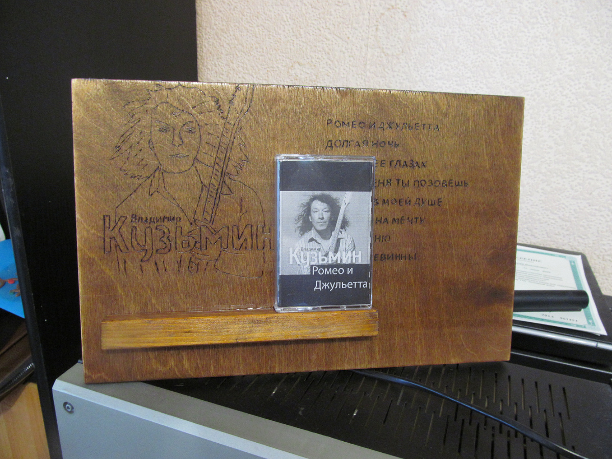 Здравствуйте, уважаемые читатели! Ранее я писал, что мне наконец-то удалось завершить работы по второму сувениру для подписчицы канала, что я обещал сделать еще в районе Нового года. На днях сувенир наконец-то был отправлен подписчице с ником ГАЛИНА ЛЕОНИДОВНА. Она писала, что у нее желание иметь сувенир с альбомом Владимира Кузьмина Ромео и Джульетта. Сегодня, как и обещал, расскажу о том, как я изготавливал этот сувенир. Сразу скажу, что у меня уже была заготовка, причем уже обработанная морилкой под цвет красного дерева. Я распечатал на принтере обложку от одного из релизов Владимира Кузьмина. Мне он показался более интересным, нежели обложка от самого альбома Ромео и Джульетта. С помощью переводной бумаги и простого карандаша я перенес рисунок на поверхность заготовки. Затем с помощью электрического выжигателя рисунок был реализован в технике выжигания по дереву. Следом я перевел на правую часть заготовки список песен с альбома Ромео и Джульетта Владимира Кузьмина. Также текст был