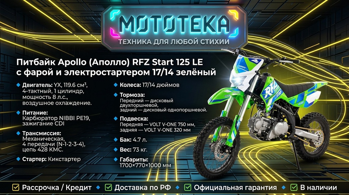 Коллеги, технические данные по питбайку Apollo RFZ Start 125 LE (зеленый, 17/14). 🔹 Двигатель: YX, 125 см³, 4-тактный, 1 цилиндр, мощность 8 л.с., воздушное охлаждение. 🔹 Питание: Карбюратор NIBBI PE19, зажигание CDI. 🔹 Трансмиссия: Механическая, 4 передачи (N-1-2-3-4), цепь 428 KMC. 🔹 Стартер: Кикстартер. 🔹 Колеса: 17/14 дюймов. 🔹 Тормоза: Передний — дисковый двухпоршневой, задний — дисковый однопоршневой. 🔹 Подвеска: Передняя — VOLT V-ONE 750 мм, задняя — VOLT V-ONE 320 мм. 🔹 Колесная база: 1220 мм, высота седла 840 мм, клиренс 330 мм. 🔹 Бак: 4.7 л. 🔹 Вес: 73 кг. 🔹 Габариты: 1700×770×1000 мм. 🔹 Освещение: Фара. 🔹 Документы: Без ПТС. Ключевая особенность — карбюратор NIBBI PE19, подвеска VOLT, наличие фары и яркий зеленый цвет. Ссылка на товар: https://clck.ru/3T4cpG #Apollo #RFZStart125LE #Питбайк #Техника #МотоТека #Спецификация