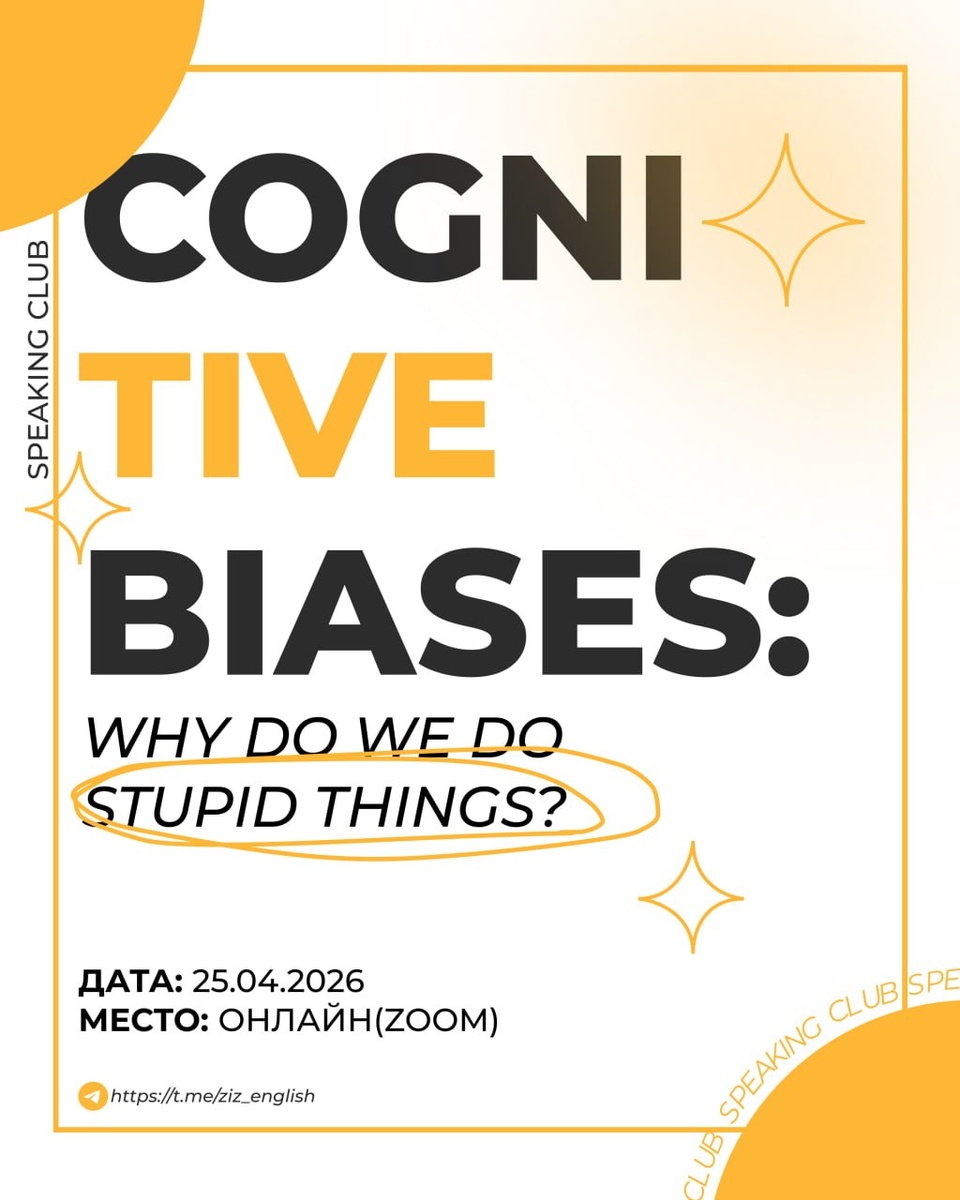 ? 🤔 Наш мозг — мастер обмана. Мы думаем, что принимаем решения логично, но на деле попадаем в ловушки, которые называются Cognitive Biases. Приходи на SPEAKING CLUB на тему: COGNITIVE BIASES: Why do we do stupid things? Дата: 25.04.2026 Место: онлайн на платформе Zoom Будем обсуждать, как ловушки мышления портят нам жизнь и как начать замечать их за собой — и всё это на английском! Что ты получаешь всего за $3? ⭐️ 🔥 60 минут живого общения в группе ⏺️Upgrade Pack в личку после занятия ⏺️Video recording (пересмотри себя со стороны) ⏺️Self-analysis guide (гайд, как разобрать свои ошибки) ⏺️Author’s materials (авторский вокабуляр и разбор темы) Цена: 9 BYN ($3) — дешевле, чем чашка кофе, но гораздо полезнее для твоего мозга! 👉 Пиши нам в тг @mag_english, чтобы забронировать место!