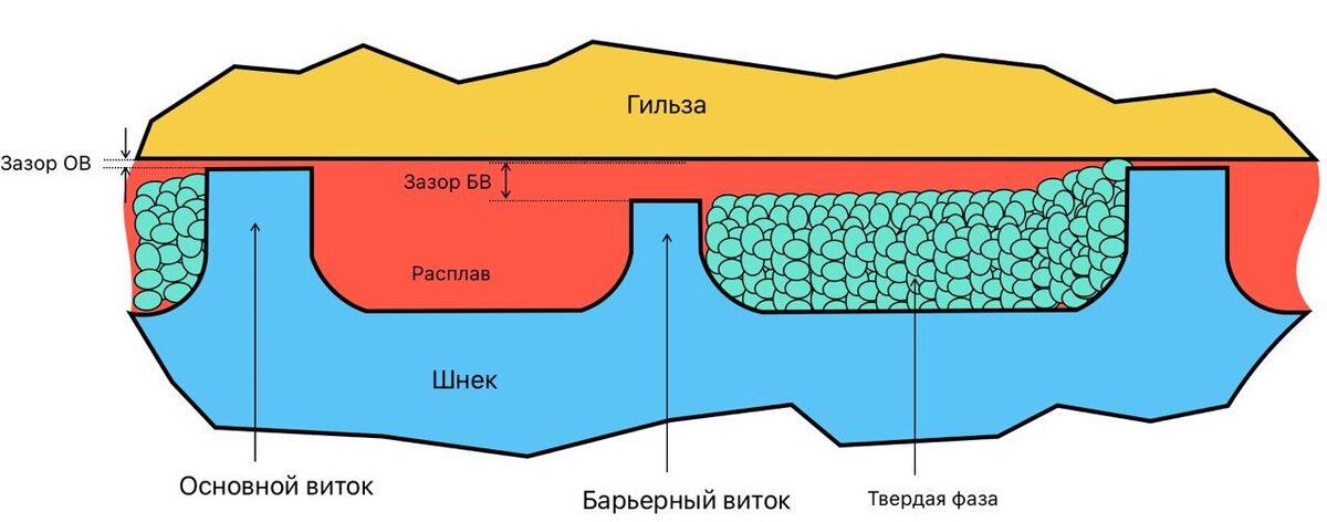 ) Проблема: Медицинская компания разрабатывала новый продукт из термопластичного эластомера (ТПЭ). В процессе экструзии на существующих шнеках наблюдалась значительная деградация материала — молекулярная масса конечного продукта падала ниже требуемого минимального уровня. Используемые шнеки: Барьерный шнек — с подрезом барьера Шнек с рифленым смесителем типа LeRoy/Maddock Ни один из них не обеспечивал сохранение молекулярной массы. Цель: Спроектировать шнек, который минимизирует механическую деградацию ТПЭ и обеспечит требуемую молекулярную массу продукта. 🔍 Анализ Механизм механической деградации: Возникает при высоких напряжениях, приложенных к расплаву полимера. Чем выше молекулярная масса, тем сильнее деградация. Исследование на PLA (полимолочной кислоте) показало: PLA63 (высокая ММ) теряет больше, чем PLA48, и в итоге имеет даже более низкую конечную ММ. Опасные зоны в шнеках: Подрез барьера — весь расплав проходит через узкий зазор, скорость сдвига в 5 раз выше, чем в