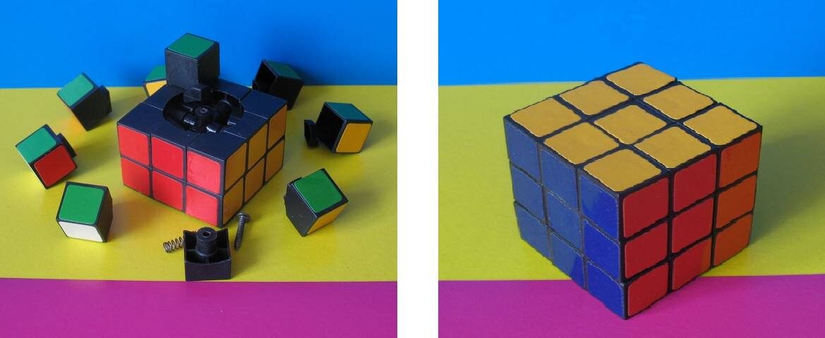 Интересен механизм игрушки, который многократно усовершенствовался и сегодня существует множество его вариаций. В середине игрушки расположена крестовина из трех маленьких цилиндров, пересекающихся под прямыми углами в трех взаимно перпендикулярных плоскостях. К концам крестовины, с помощью подпружиненных винтиков, крепятся шесть фигурных деталей, которые представляют собой как бы половинки кубиков с одной из граней в виде вогнутой сферы. Противоположная грань у каждого 6-ти таких полу-кубиков имеет свой цвет. Восемь кубиков выполнены с выступами, которые не видны снаружи и пружинисто соприкасаются еще с одним центральным полу-кубиком на оси. Эти восемь кубиков внутри игрушки образуют своими выступами многоугольник, близкий к сфере. Поскольку все детали игрушки сжаты пружиной не слишком сильно, при небольшом усилии они могут смещаться по сферической поверхности. Перемещая таким образом детали игрушки и меняя сочетания цветов отдельных граней, можно получить невообразимо большое количество вариаций: 43252 003 274 489 856 000, или более 43 квинтиллионов комбинаций. Причем доказано, что из любой такой комбинации привести игрушку к исходному состоянию с 6-тью гранями, окрашенными в один цвет можно всего за 20 поворотов.