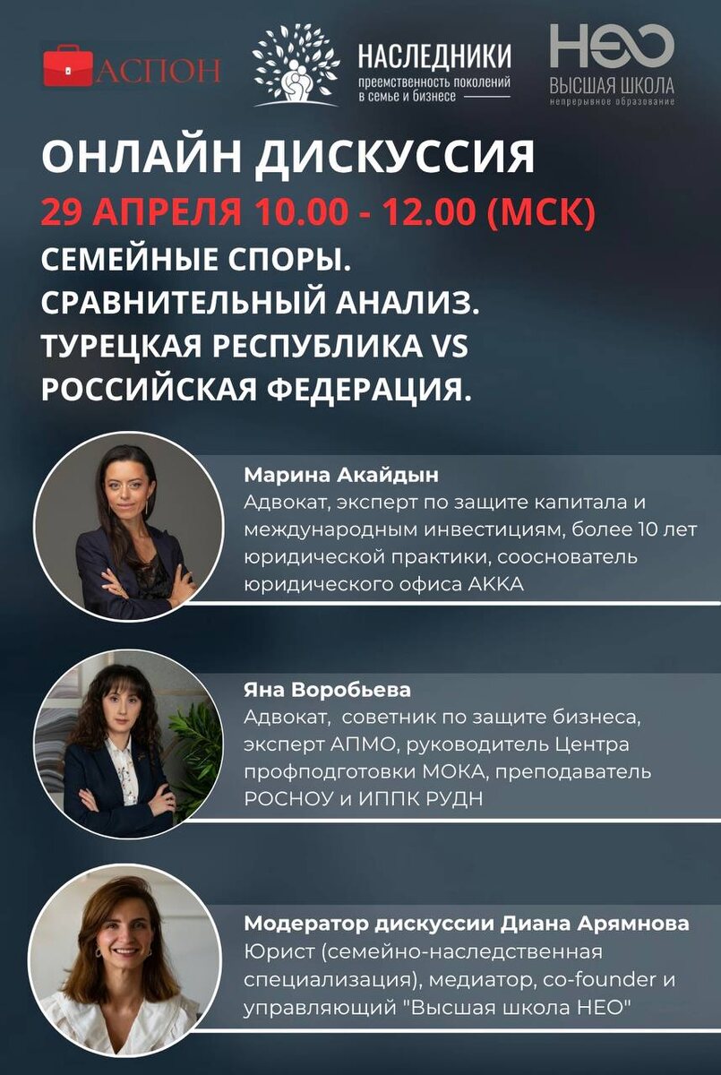Сравнительный анализ. Турецкая Республика vs Российская Федерация. 29.04.2026 (с 10:00 до 12:00) онлайн дискуссия. Споры с иностранным элементом - это всегда точка профессионального и финансового роста специалиста. В Высшей Школе НЕО мы решили провести уникальное мероприятие с двумя экспертами, адвокатами двух стран: Турции и России, чтобы посмотреть на особенности семейных споров через призму похожести и различий в законодательстве этих двух стран. 📍Регистрация брака; 📍Законный и договорный режимы имущества супругов; 📍Детские споры и алименты; 📍Компенсации морального вреда; 📍Расторжение брака. На нашей дискуссии вы получите четкое представление о том, как действовать, если в споре у вашего клиента присутствует иностранный элемент (брак с гражданином Турецкой Республики, а также в этой стране приобретены объекты недвижимости). 👩💼Спикеры: • Марина Акайдын, адвокат, эксперт по защите капитала и международным инвестициям, более 10 лет юридической практики, сооснователь юриди