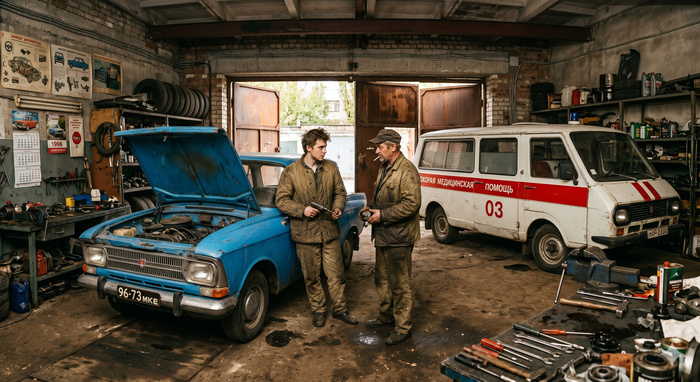 90-Е. Студент-медик. Стипендия — слёзы, а ездить надо. Купил я древний «Москвич-412», крашенный кисточкой в синий цвет. Гнил он быстрее, чем ездил. По старой памяти мне разрешали ремонтироваться в гараже при подстанции Скорой — мол, свой, в стационаре медбратом подрабатываю. Публика в гараже серьезная. Брутальные, прокуренные дядьки с вечным перегаром «Тройного». Главный — Михалыч, корабельный механик в прошлом. Законы там суровые, и терминология известная: корабли ходят, а отверстие — не дырка. И вот я, сопляк в замасленной телогрейке, решил вставить свои пять копеек. Приколоться над авторитетами. Ковыряюсь в движке, как раз понадобилось сверло на 12. Кричу через яму Михалычу, который священнодействует над трамблером «РАФика»: — Михалыч! Есть сверло на двенадцать? Мне тут ДЫРКУ в прокладке просверлить надо. Тишина. Петрович в соседнем боксе уставился на меня, как на женщину на палубе крейсера. Михалыч медленно выпрямляется, поднимает вверх палец, измазанный солидолом, и тоном професс